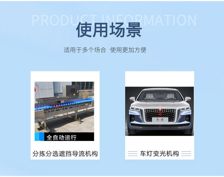 應(yīng)用:分揀分選遮擋導(dǎo)流機(jī)構(gòu)、車燈變光機(jī)構(gòu)